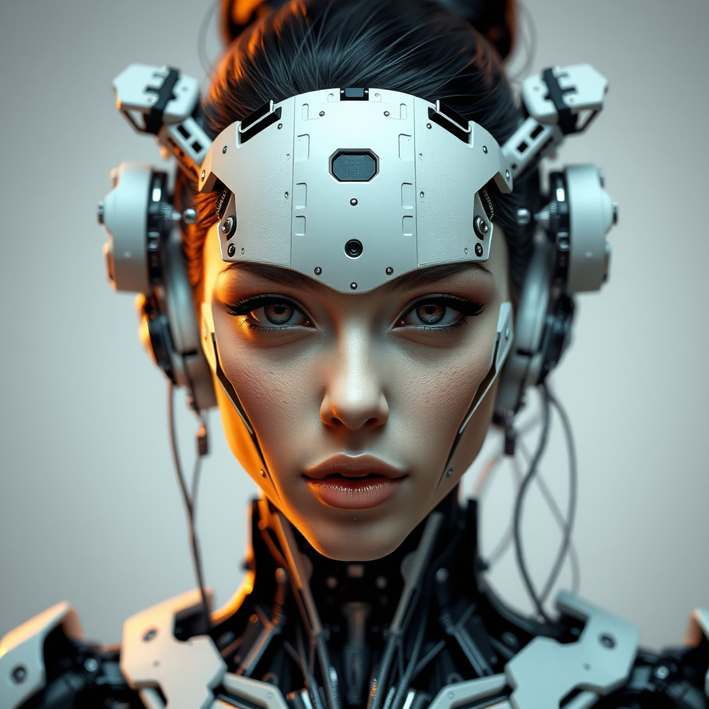 Realistic photograph of a woman with intricate robot parts, digital 3D rendering, hard surface design, real-time visual effects, highly detailed character design, trending on ArtStation, sharp focus, UHD resolution, HDR quality, out of frame elements, abstract touch with slight blur, intentionally exaggerated proportions, no signature, random words and abstract watermark subtly integrated.