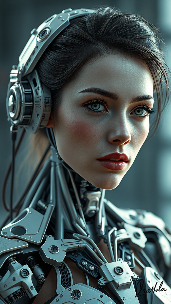 Realistic photograph of a woman with intricate robot parts, digital 3d, showcasing hard surface design, real-time rendering, featuring vfx elements, characterized by highly detailed and intricate character design, trending on art platforms, captured in sharp focus, uhd clarity, hdr effects, slightly out of frame, incorporating aspects of surreal art with intentional imperfections like blurry edges and unique proportions, includes subtle signature-like motifs, abstract words and descriptions, and an artistic watermark.