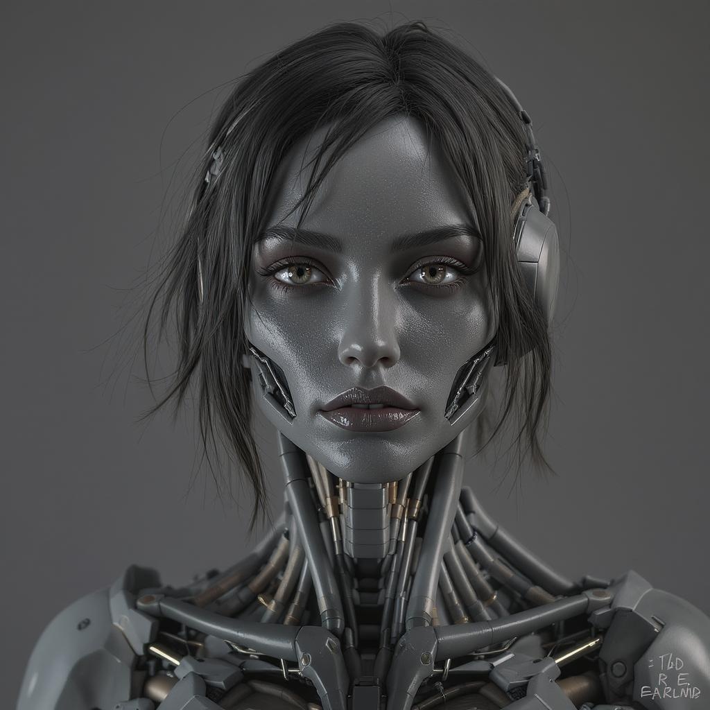 Realistic photograph of a woman with intricate robot parts, digital 3d render, hard surface design, real-time vfx elements, detailed character creation, highly intricate, trending on artstation, sharp focus, ultra high definition, hdr, intentionally out of frame elements, purposeful artistic blurs, unconventional proportions, artist's signature stylized, abstract words subtly integrated, creative watermark artistry.