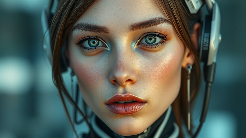 Realistic photograph of a woman with robotic elements, digital 3D, hard surface features, real-time rendering, VFX integration, complex character design, highly detailed and trending on ArtStation, sharp focus with UHD and HDR quality, elements slightly out of frame, intentionally blurred sections, unusual proportions, abstract signature-like patterns, faint text and descriptions, subtle watermark presence.