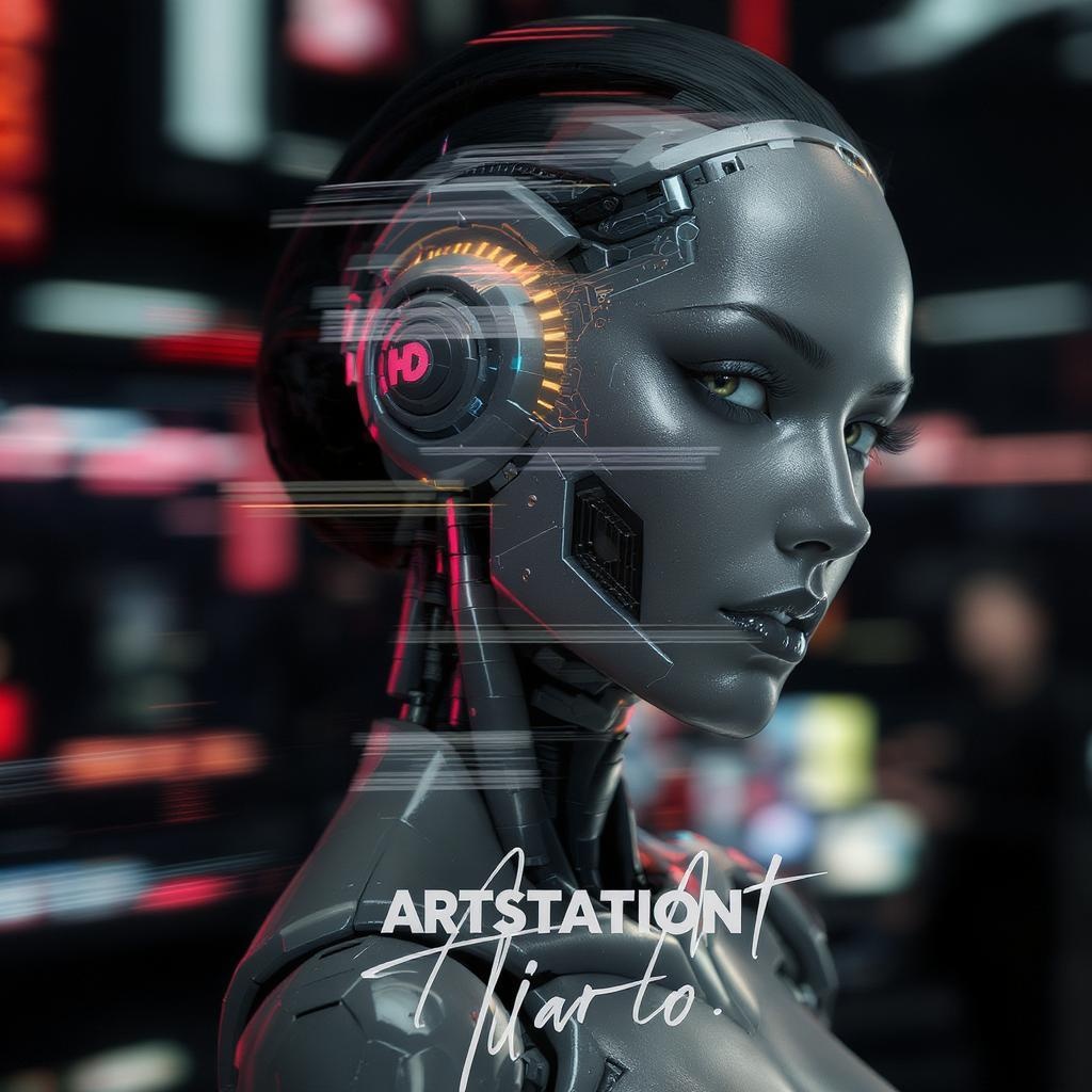 Realistic photograph of a woman with robotic elements, digital 3D, featuring hard surface designs, real-time rendering, intricate character construction, highly detailed and trending on ArtStation, sharp focus, UHD and HDR quality. The scene captures a dynamic perspective, portraying the figure with out-of-frame elements. The artwork embodies surreal imperfections with blurry areas and exaggerated proportions, incorporating abstract markings and blurred text elements reminiscent of a signature or watermark in a visually compelling manner.