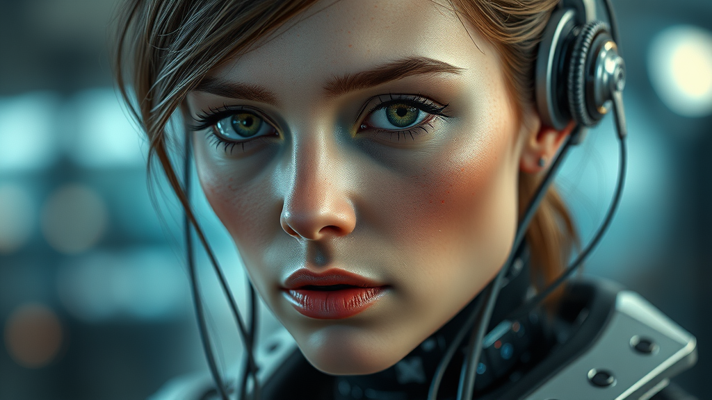 Realistic photograph of a woman with robotic enhancements, featuring digital 3D elements and hard surface design, emphasizing real-time VFX and intricacy in character design. The image is highly detailed, trending on art platforms like ArtStation, with a sharp focus in UHD and HDR. The artwork captures slightly out-of-frame elements, adding a touch of deliberate imperfection with blurred areas and quirky proportions. There are subtle, unintelligible script-like marks reminiscent of a signature or watermark, incorporated naturally into the scene.