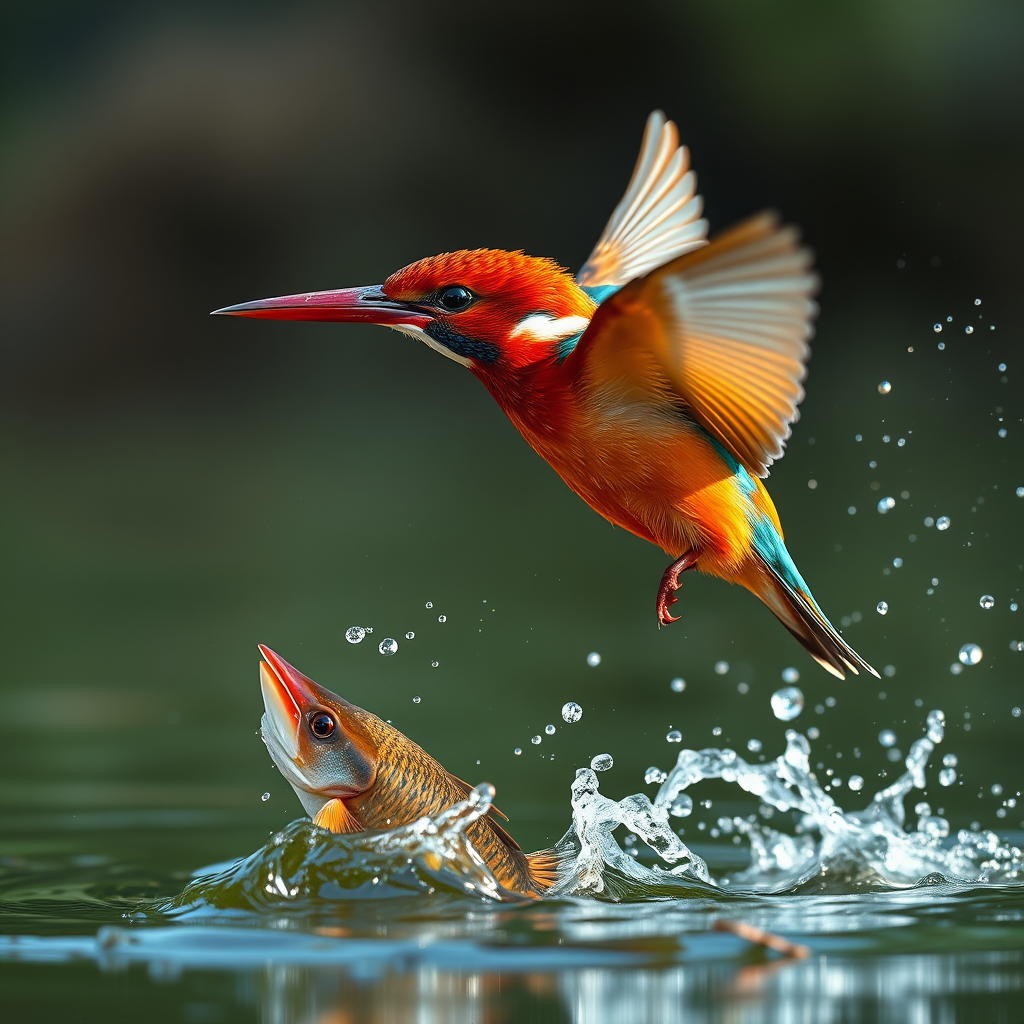 Realistic photography of a vibrant kingfisher swooping down to catch a fish, its bright plumage shimmering in a mix of red and orange hues, illuminated by cinematic lighting. Shot with an 85mm lens, the scene captures the dynamic motion and splash of water in an elongated 4:3 aspect ratio, exuding a sense of precision and elegance.