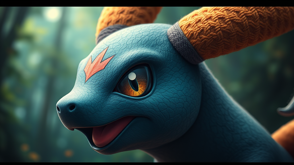 Realistic Pokémon portrait, detailed texture, vivid colors, high contrast, moody shadows, intense focus on features, lifelike atmosphere, dynamic lighting, nature-inspired setting, captivating expression.