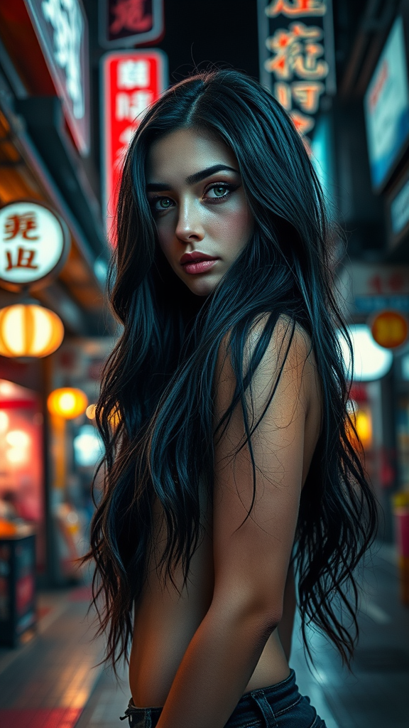 Realistic portrait of a stunning young model, with lush dark hair resembling flowing ink, standing amidst the vibrant atmosphere of an Asian market at night. The scene is illuminated by flickering neon signs and city lights, casting a cinematic glow. Her green eyes are mesmerizing, with a melancholic yet captivating expression. Her figure is perfectly toned, showcasing long legs and a symmetrical face with striking high cheekbones, delicate freckles, and subtle makeup enhancing her natural beauty. The photograph captures the ambiance with an ultra high-definition lens, featuring a bokeh effect and a hint of lens flare, highlighting the intricate details and textures.