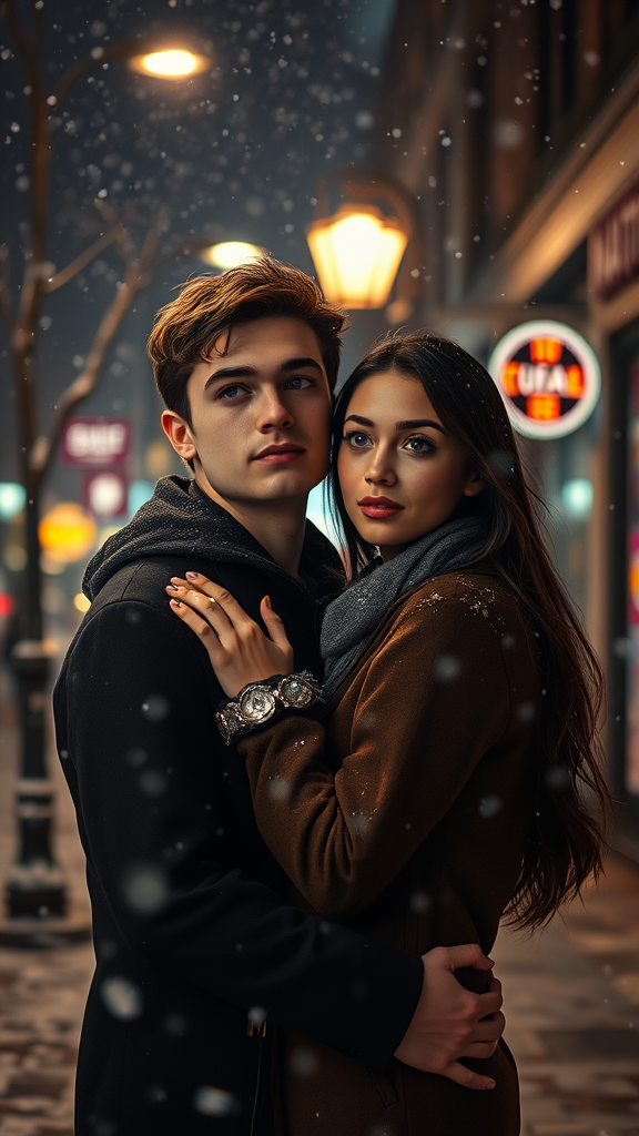 Realistic portrait of a young man with short chestnut hair and deep brown eyes embracing a young woman with luxurious black hair and striking blue eyes on a snowy night, standing closely on the sidewalk under a softly glowing streetlamp. They gaze upwards, enveloped in the gentle snowfall that blankets the silent street. In the background, blurred neon signs of shops add vibrant splashes of color to the night cityscape. The scene is captured with a cinematic lens that accentuates the darkness and scattered lights, delivering ultra-high-definition detail. The falling snow creates a serene and magical atmosphere, blending with the intricate shadows and highlights, suggesting a moment suspended in time. The image captures the essence of peace and companionship during a quiet winter night in the city.
