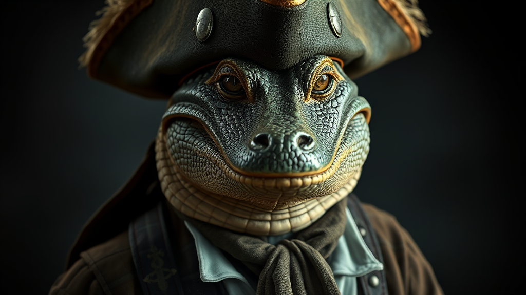 Realistic portrait of an anthropomorphic alligator donning 18th century pirate attire with a weathered tricorn hat and a rugged neck tie, embodying a video game character with lifelike cinematic lighting. The portrait features intricate details, showcasing the alligator's textured scales and expressive eyes, set in a dramatic composition. The setting exudes an evocative atmosphere with high-definition resolution, evoking the quality of an HBO production. The use of shadow and light enhances the dark, stormy colors, adding depth and intensity to the character's pirate persona.