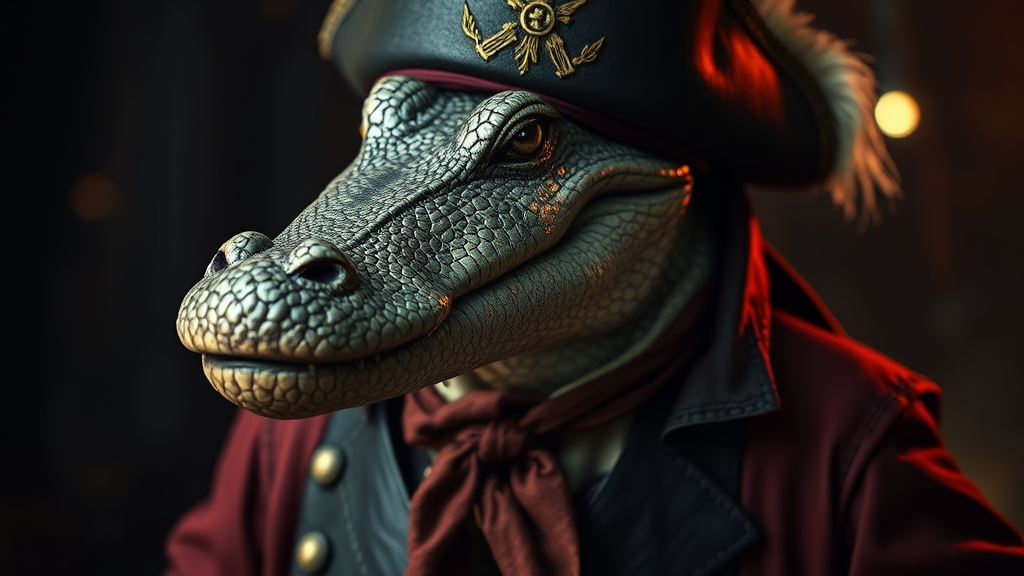 Realistic portrait of an anthropomorphic alligator dressed in 18th century pirate attire with a tattered neck tie, designed as a video game character. The image features cinematic lighting highlighting the highly detailed textures of the scales and fabric. Presented in portrait view, the scene is in HD, 4K quality akin to HBO standards, with a focus on dramatic lighting that casts deep shadows, utilizing a palette of dark, rich colors. Enhancements include subtle hints of nautical elements, like a barnacle-encrusted tricorn hat and a weathered compass hanging from the belt.