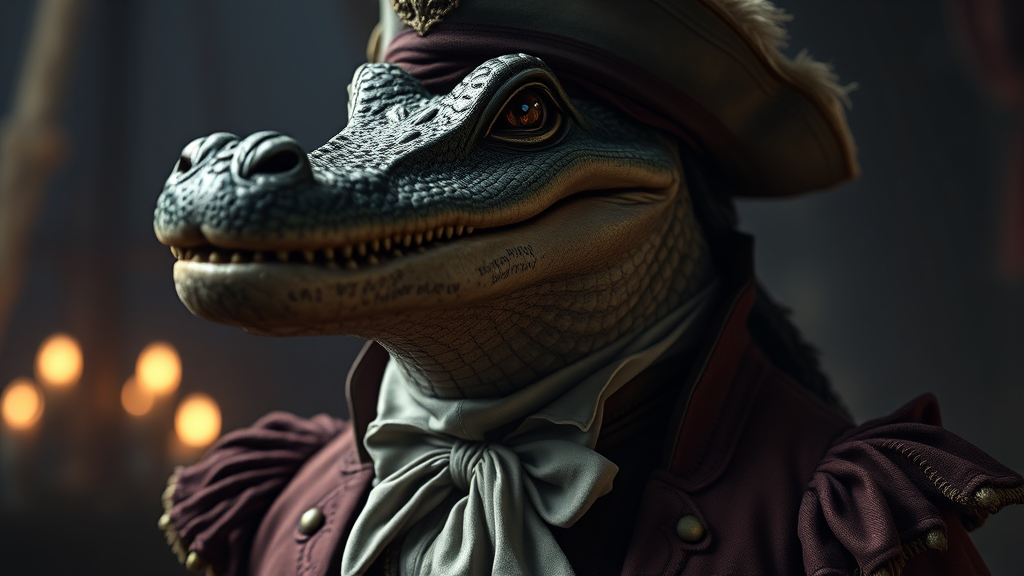 Realistic portrait of an anthropomorphic crocodile wearing elaborate 18th century pirate garb, complete with a neck tie, designed as a video game character, featuring realistic cinematic lighting, highly detailed with focus on textures, portrait view in HD and 4K quality, inspired by HBO's dramatic storytelling style, utilizing moody and atmospheric lighting with a palette of dark and rich colors, slightly weathered attire with ornate details, an intense gaze suggestive of adventure and mystery.
