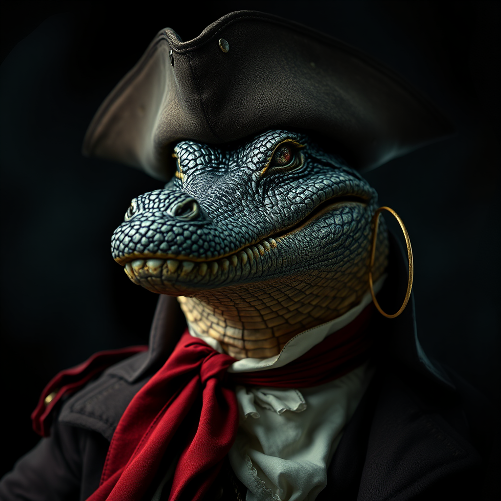 Realistic portrait of an anthropomorphic crocodile, dressed in lavish 18th century privateer attire with a weathered tricorn hat and an ornate crimson neck tie, evoking a classic video game character. The cinematic composition captures a highly detailed reptilian visage, accentuated in rich textures and scales, under dramatic, moody lighting reminiscent of a high-definition HBO series. The scene is imbued with shadowy, dark colors, bringing a sense of foreboding mystery, while the gleam of a gold hoop earring hints at treacherous adventures.