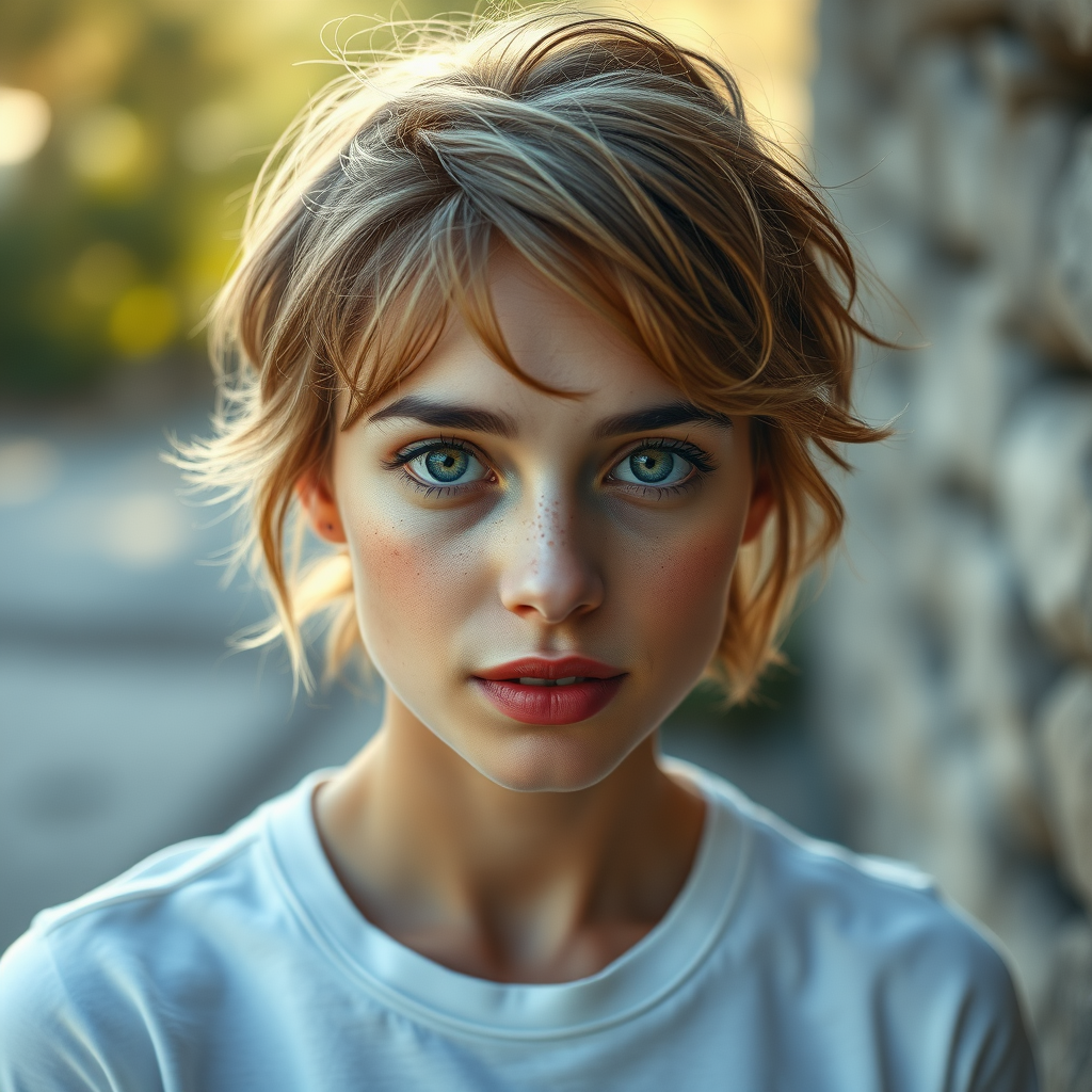 Realistic portrait of an enchanting woman with a dusting of freckles, expressive round eyes, and casually tousled short hair, captured outdoors wearing a simple white t-shirt, gazing directly at the camera with naturally chapped lips. The photograph is set in soft, natural lighting with an intimate composition that emphasizes photo-realism and exceptional detail. Skin moles add character to her appearance. The image utilizes f1.4 for depth, embracing magical and dramatic lighting effects to enhance the atmosphere. The portrait conveys a sense of raw beauty and authenticity, steering clear of common imperfections like poor anatomy or distortion, focusing instead on a harmonious and realistic depiction.