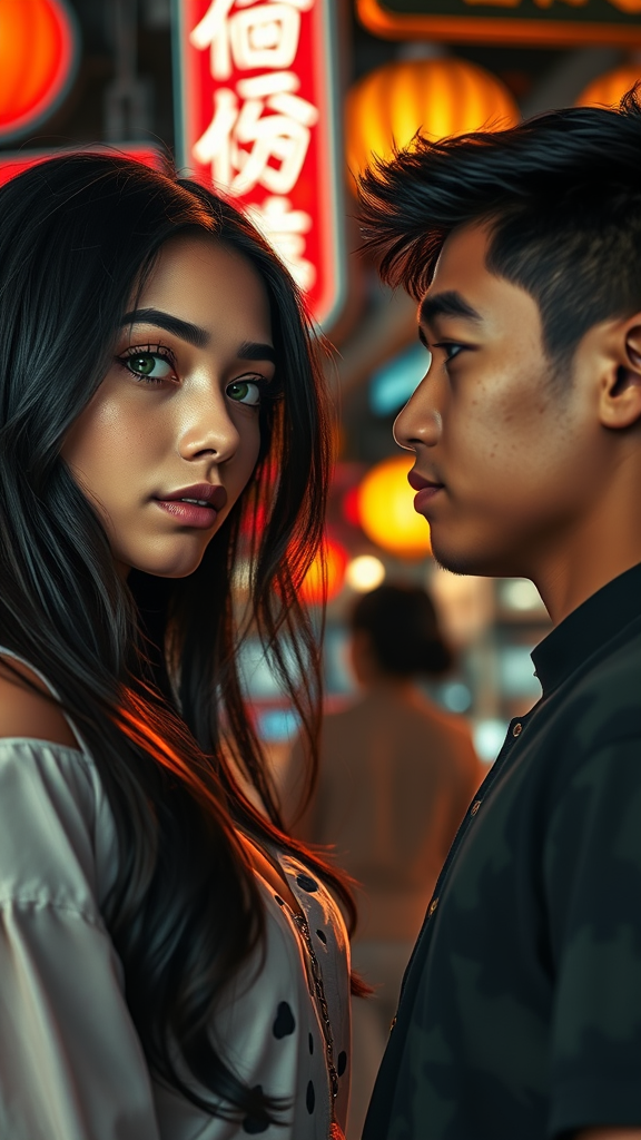 Realistic portrait of an enchanting young supermodel girl and boy standing face to face in an Asian market backdrop illuminated by vibrant shop neon signs and night city lights. The girl has captivating green eyes, long flowing ink-black hair, and delicate makeup that highlights her beautiful freckles and high cheekbones, giving her a perfect symmetrical face with expressive doe eyes. She possesses an elegant fitness body with long legs, while the boy complements her presence with a charming demeanor. Both exude a sense of romance amidst the bustling setting. Captured in ultra-high definition with HDR and 8k resolution, the scene is brought to life with cinematic lighting, aperture 1.8, creating a stunning bokeh and lens flare effect. Their expressions hold a touch of melancholy, adding depth to their extradimensional beauty amidst extremely high details and the vibrant energy of the market.
