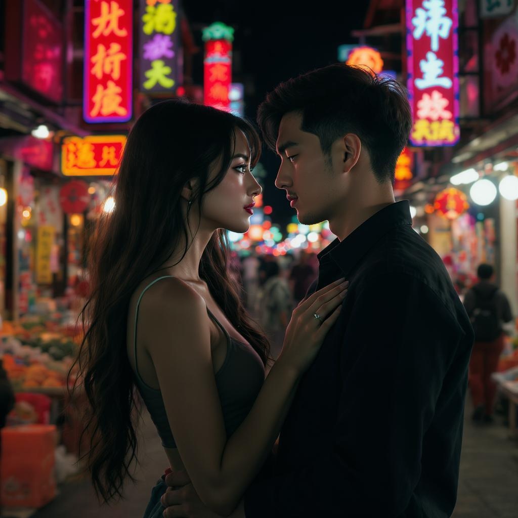 Realistic portrait of an extraordinarily beautiful girl with a boy, both gazing intently at each other, embodying the essence of youthful models. They stand face to face in a romantic stance, surrounded by the vibrant atmosphere of an Asian night market. Neon shop signs illuminate the scene, enhancing the play of city lights against their features. The girl’s green eyes and the subtle glow in the boy's gaze add depth to their expressions. Captured in a full-body photo, they boast perfect fitness physiques, with the girl’s long legs and elegantly symmetrical face drawing attention. Her expressive, doe-like eyes are framed by delicate freckles and high cheekbones, while her long, gracefully flowing hair resembles a cascade of ink, complemented by gentle makeup. Photographed with an aperture of 1.8, the image features a beautifully soft bokeh and subtle lens flare, all contributing to the couple’s melancholy yet captive expressions. The scene transcends ordinary dimensions, presented in ultra HD, HDR, and 8k resolution, capturing cinematic lights and extremely high details. The Asian market's vibrant backdrop of neon signs and nocturnal city lights complete this entrancing visual narrative.