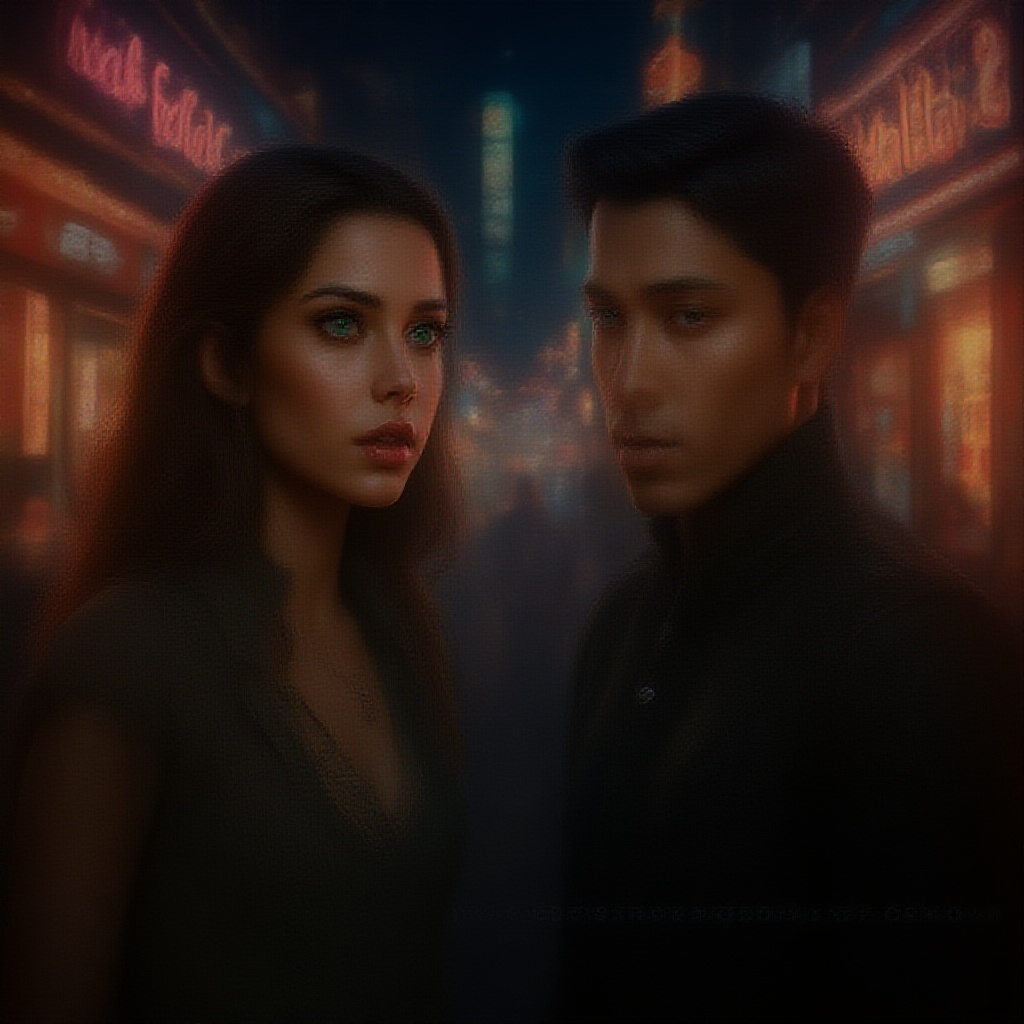 Realistic portrait of an extraordinarily beautiful young girl and boy, resembling supermodels, standing face to face with an atmosphere of romantic intrigue. The scene is set against the bustling backdrop of an Asian market with vibrant neon shop signs and glimmering night city lights. Both have captivating green eyes and possess a perfect fitness physique with long legs. The girl's face is perfectly symmetrical with expressive, doe-like eyes, adorned with beautiful freckles and high cheekbones. Her long, flowing hair resembles cascading ink, complemented by delicate makeup. The image captures a touch of melancholy in their expressions and features extradimensional qualities. Shot with an aperture of 1.8, creating a pronounced bokeh effect with cinematic lighting, lens flare, and extremely high detail. The composition is ultra HD, hdr, 8k, capturing the dynamic environment of the lively market with its colorful neon signs and nighttime ambiance.