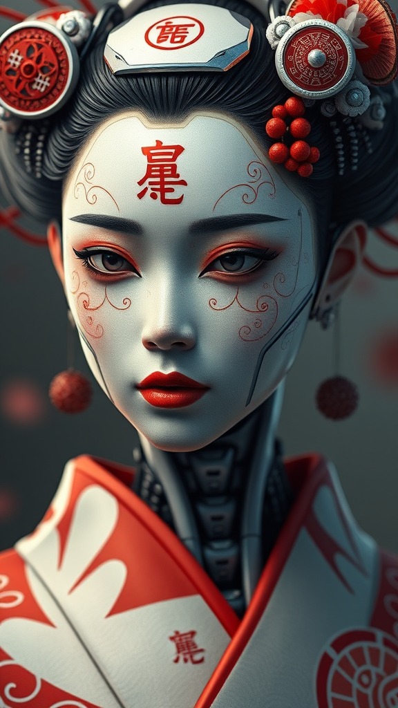 Realistic portrait painting of a Japanese robotic geisha adorned with intricate kanji symbols and decals, rendered with high detail similar to an octane render. The image aims for clarity in 4k resolution and the precision of Unreal Engine 5. Influenced by concepts from Ex Machina and I, Robot, it showcases a balance of elegance and robotics. The geisha features a harmonious blend of traditional and futuristic elements, with detailed textures and a lifelike presence. Care is taken to avoid errors such as poor anatomy or resolution issues, ensuring the portrayal is coherent and visually captivating.