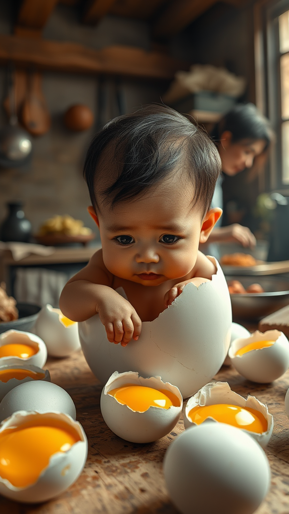Realistic portrayal of a large-headed baby with the face of an Indonesian adult man, peeking out from a recently cracked egg, gripping the edge of the shell while surrounded by a vibrant, glossy yolk. The backdrop features several similarly broken eggs scattered across a rustic kitchen scene, where a woman is busily preparing a meal. The atmosphere is warm and lively, with sunlight streaming through a window and a hint of sizzling sounds in the air, capturing the essence of home-cooked comfort. Ultra HD, 5k quality.