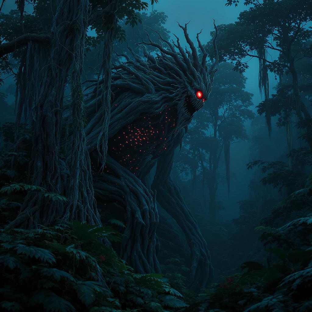 View this AI-generated image featuring a hyper detailed realistic rendering of a mysterious jungle setting featuring a menacing wood creature with intricate textures and a piercing red eye the creature blending seamlessly into the dense verdant foliage has an eerie anthropological quality echoing tr