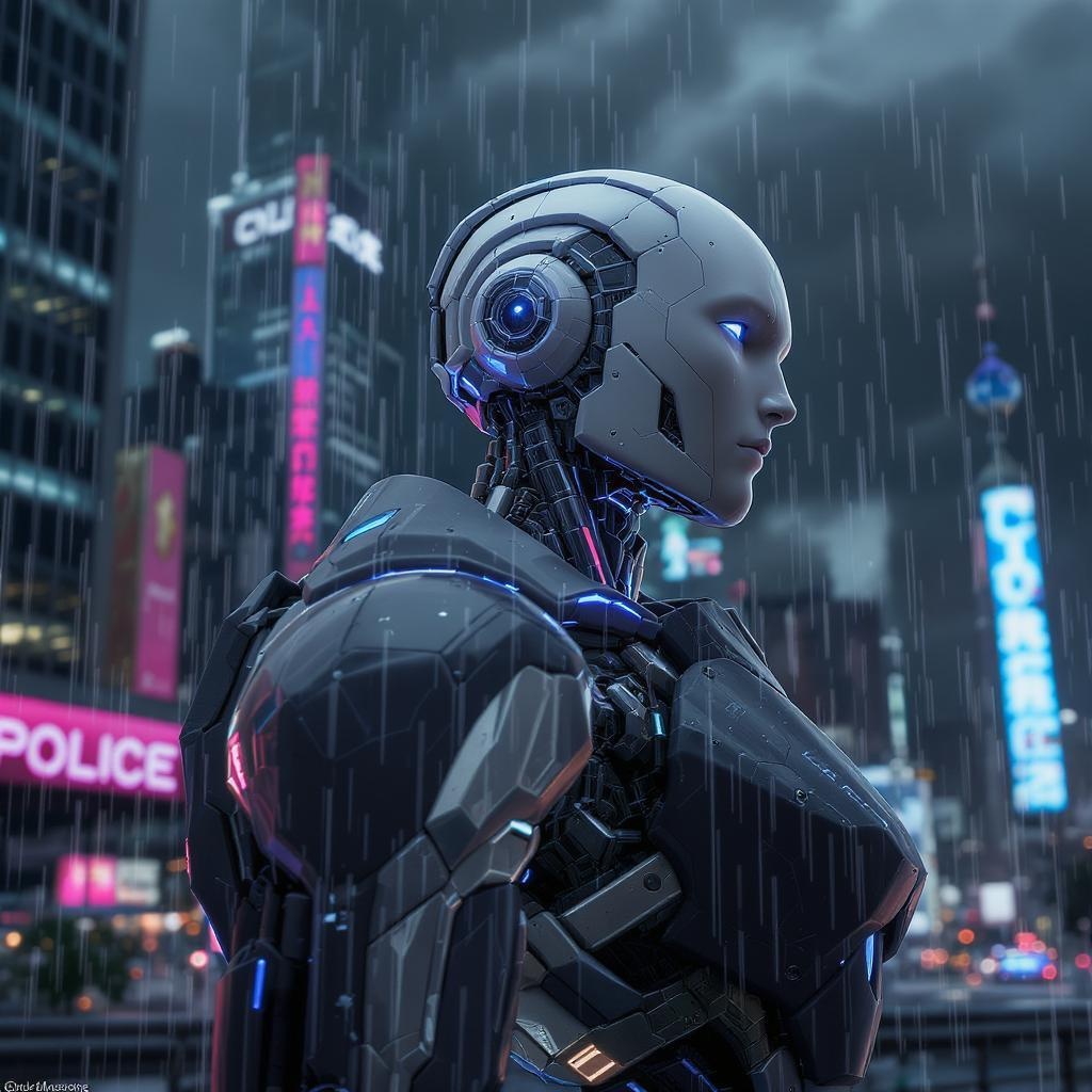 Realistic ultra HD photograph of a police robot in a futuristic cityscape, blending cyberpunk aesthetic with intricate mechanical design. The robot features a detailed, symmetrical face with smooth digital 3D elements and hard surface geometry. It is dressed in asymmetrical clothes with abstract metal textures, showcasing a seamless blend of illustration and cybernetic anatomy. The character design highlights real-time VFX with a side profile capturing its advanced features. The scene includes artistic elements like holes and negative space, creating a sense of motion and dynamic composition. Despite the complex design, the image avoids deformed or ugly proportions, maintaining harmony and detail without any text or watermarks.