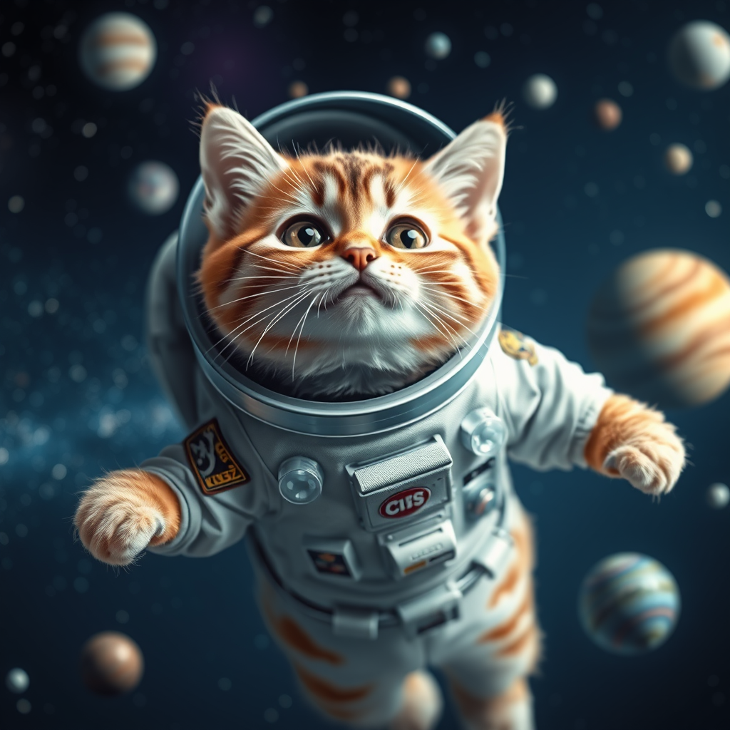 Realistic ultra-high-definition image of an adorable cat wearing an astronaut suit, with a playful expression, floating in a cosmic backdrop filled with twinkling stars and distant planets. The suit is detailed with tiny patches and insignias, reflecting the cat's adventurous spirit as it explores the vastness of space.