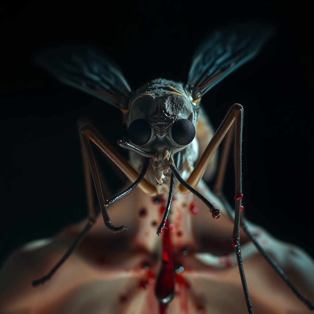 Realistic unsettling mosquito, illuminated by natural light, intricate skin details, eerie atmosphere, horror elements, blood-soaked body, lifeless black eyes, numerous scars, shadowy backdrop, exaggerated fangs, extreme close-up scene.