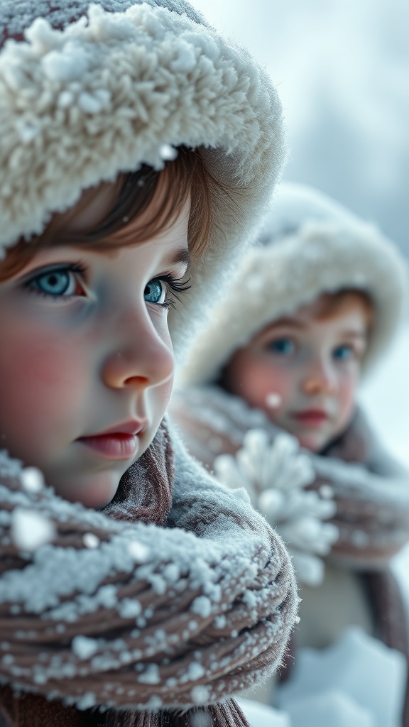 View this AI-generated image featuring realistic winter wonderland featuring charming faces as focal points their eyes sparkling with innocence set against a breathtaking snowy landscape the scene is captured in exceptional clarity showcasing intricate details rendered in 8k resolution a cinematic a
