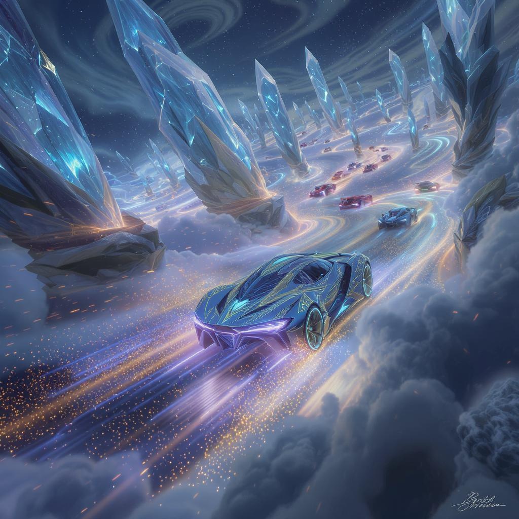 In a mystical realm, an exhilarating and lifelike depiction of a fantasy car race unfolds, channeling the thrilling essence of high-speed chases. Here, enchanted sports cars compete tirelessly on a breathtaking track made of swirling clouds, harnessing mystical powers to defy gravity. As these vehicles zoom through the sky, they leave trails of shimmering stardust, weaving through towering pillars of crystal and navigating through chaotic storms of swirling wind. With engines humming with magical energy, drivers skilled in both racing and sorcery maneuver through complex aerial maneuvers, pushing the boundaries of possibility in an electrifying contest that marries the art of sorcery with the adrenaline-fueled rush of speed.