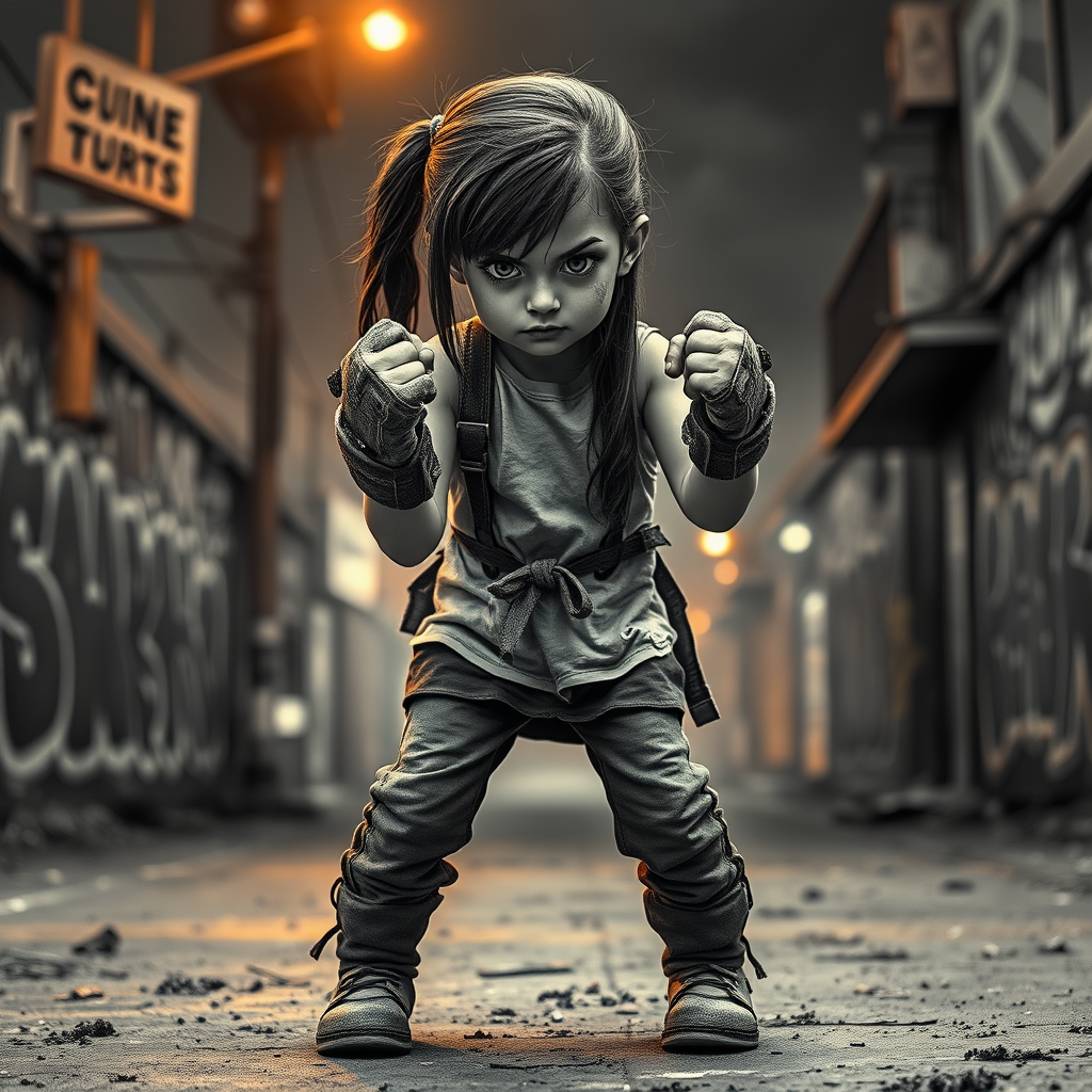 rebel girl standing in a battle-ready stance, legs spread wide with a scuffed up worn-out glove on one hand and a grass-stained ribbon tied around her wrist, her eyes narrowed and lips pressed in a determined line as dirt smudges her cheeks and her runny nose drips a tiny droplet onto her lip, hands clenched into fists with splayed fingers, against a blurred and stormy urban backdrop of rebellious graffiti and flickering streetlights that casts an eerie orange glow on her tense figure, capturing her with an ar 0.67:1 aspect ratio and a high quality setting of 1.4, shot in high contrast black and white with subtle texture, and at a sharp level of detail of 1500.
