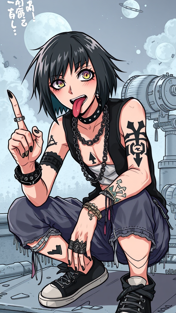 rebellious street punk with emo style clothing, middle finger raised defiantly, direct gaze, male character with a bob haircut, playfully sticking tongue out with closed mouth, crouching pose, tattered outfit, adorned with piercings, jewelry, and tattoos, set against an observatory backdrop, featuring a highly detailed and elaborate background, showcasing a stunningly absurd resolution, premium quality 3d, cartoon and anime influences, sketch-like elements, moderate resolution, and standard quality