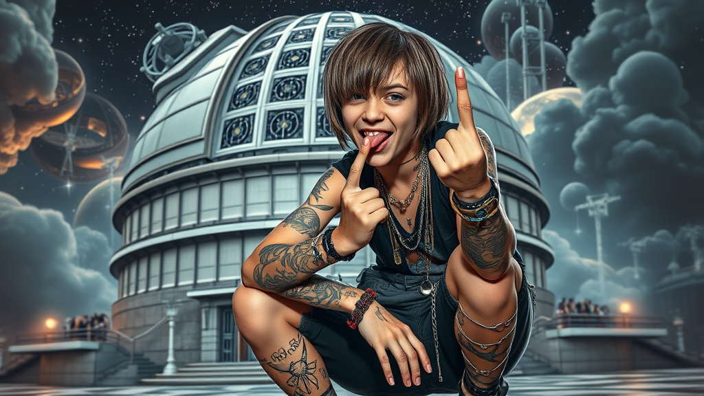 Rebellious teen in emo fashion, giving the middle finger, boy with a bob haircut, playfully sticking his tongue out with a mischievous grin, squatting in tattered attire, adorned with piercings, edgy jewelry, and striking tattoos, set against the backdrop of a grand observatory with an intricately detailed and stunningly complex background, captured in ultra-high resolution, showcasing exceptional quality.