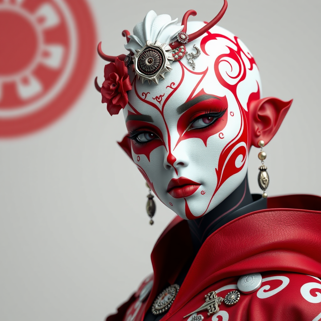 red and white face paint by wysi, futuristic victorian style with japanese art influences, sculpted in zbrush, reminiscent of mark brooks' work, wiccan elements, balanced and harmonious colors, japanese-inspired themes, intricate and elegant detailing