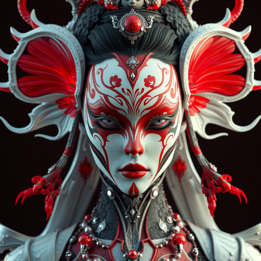 red and white face paint, futuristic victorian style, japanese art influences, crafted in zbrush, reminiscent of mark brooks' style, wiccan elements, balanced and harmonious colors, hints of japanese aesthetics, elongated proportions, intricate details, ethereal and otherworldly ambiance, blending tradition with futuristic elegance