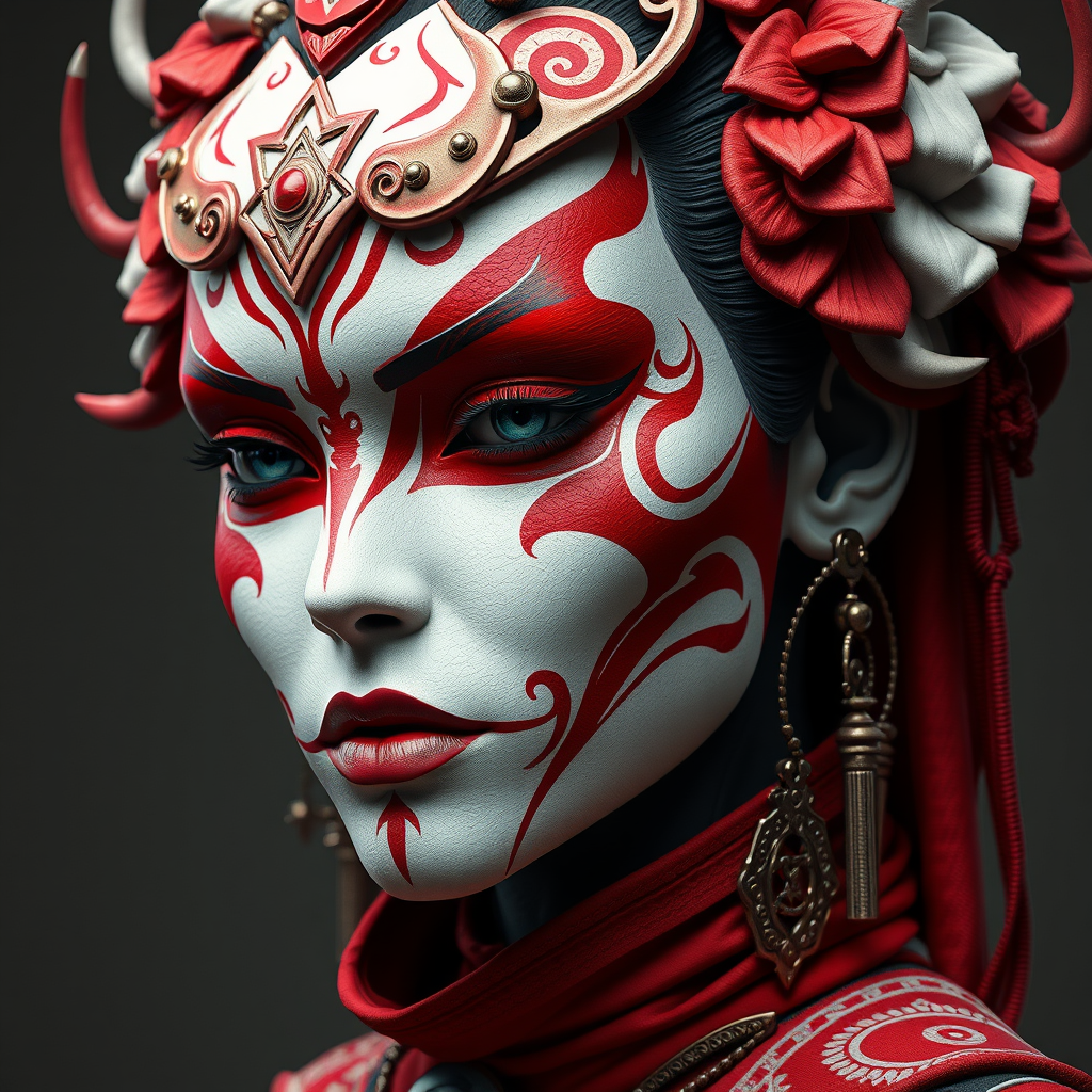 Red and white face paint, futuristic Victorian style with Japanese-inspired elements, art style reminiscent of ZBrush and Mark Brooks, incorporating a wiccan theme with harmonious coloration, blending traditional Japanese aesthetics.