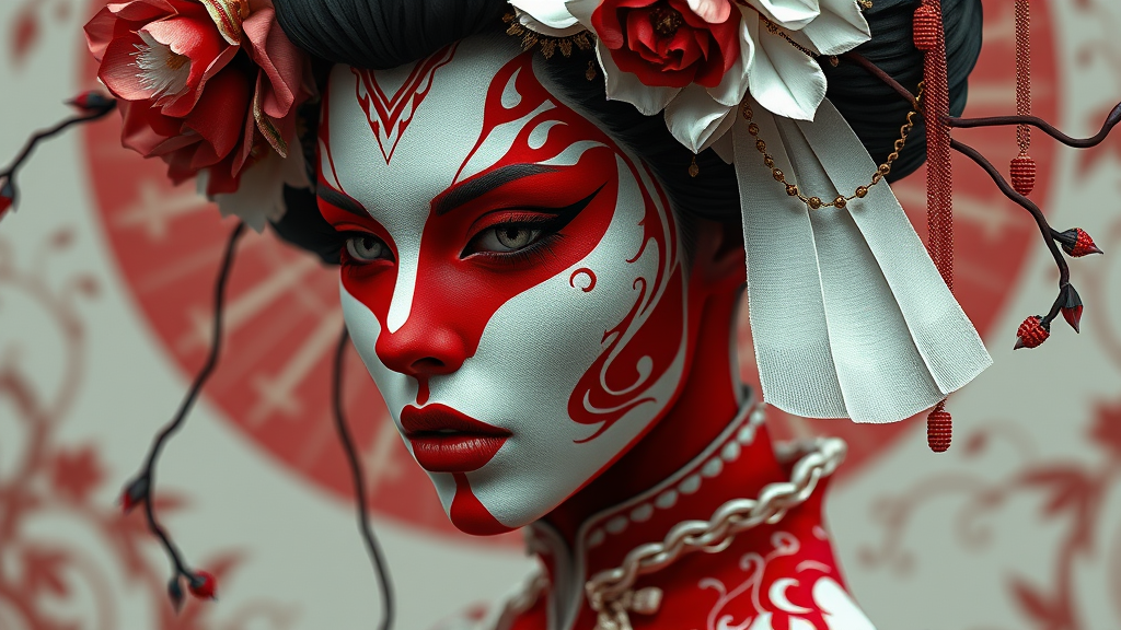red and white face paint in a futuristic victorian style blends seamlessly with japanese-inspired art, influenced by zbrush techniques and the visionary touch of mark brooks. the composition embodies wiccan elements with harmonious coloration, intertwining traditional japanese aesthetics. aspects of elegance and avant-garde design are accentuated by elongated proportions and intricate details, crafting a visual symphony that resonates with both modernity and timeless tradition.