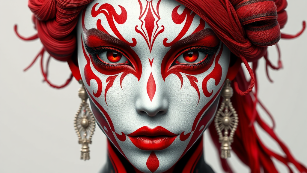 Red and white face paint in a futuristic Victorian style with Japanese-inspired art elements, rendered in the style of ZBrush with influences from Mark Brooks. The design blends wiccan themes with a harmonious coloration, maintaining a strong Japanese aesthetic influence. Aspect ratio 14:25, version 6.0, with slight creative adjustments to enhance uniqueness while preserving the original concept.