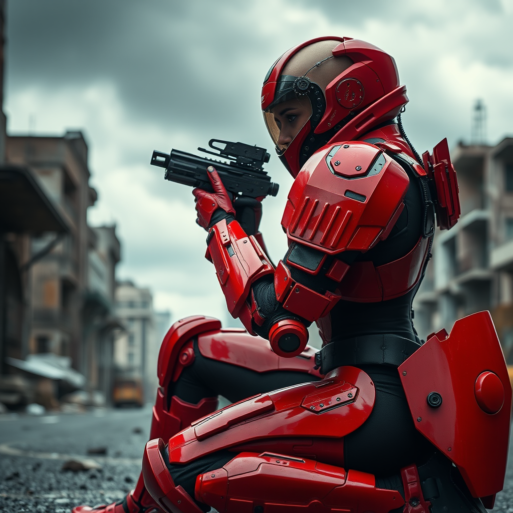 Red-armored female figure in futuristic battle armor with a cybernetic helmet kneeling, aiming her weapon with precision. Her bald head is covered by a sleek, sci-fi mask and visor, exuding coolness and intensity. The intricate plate armor fits seamlessly, resembling a spacesuit with elaborate details. She is set against a backdrop of a ruined city street, under an overcast sky, enhancing the moody atmosphere. Natural light highlights the scene with photography-like textures and subtle blur, creating a photorealistic, cinematic effect. The rendering employs ray tracing for the highest detail, capturing the action in an 8K Ultra-HD third-person view, incorporating cinematic and natural lighting with a touch of long exposure for a dynamic composition.