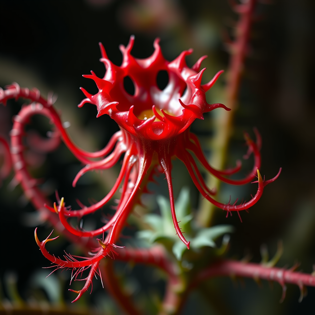 Red carnivorous drosera plant with spiny tentacles, intricately rendered, reminiscent of a Rembrandt painting, trending on art platforms like CGSociety and ArtStation, with a focus on high detail and avoiding anatomical errors, embodying a Midjourney Style.