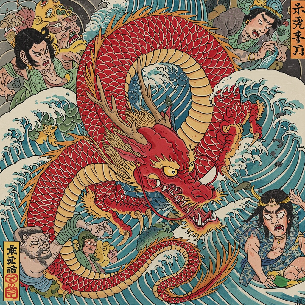 View this AI-generated image featuring a vibrant red dragon dances through swirling ocean waves capturing the essence of neo traditional japanese art its scales shimmer with intricate detail reminiscent of k ji morimoto s imagination while the epic narrative unfolds like a john blanche mural amidst