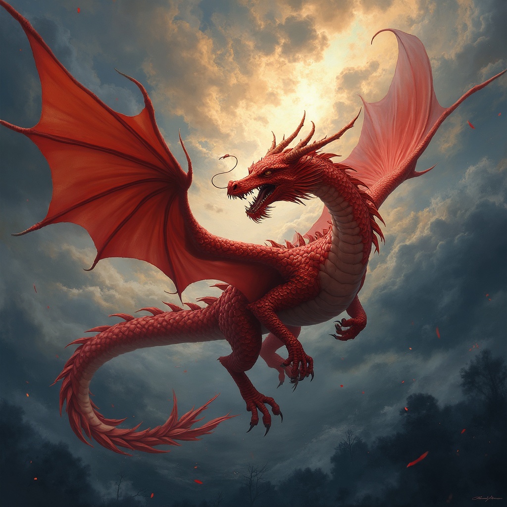 A majestic red dragon soars under a tumultuous, stormy sky, its scales glistening in an intricately harmonious blend of colors, an artistic homage to Tatiana Suarez. Strong symbolic elements echo the impactful brushstrokes of Chuah Thean Teng, melding with the striking realism characteristic of Ivan Fedorovich Choultse. The scene is infused with the rich textures and vibrant hues of Indonesian art, capturing the dragon's dynamic movement in exquisite detail, set against a backdrop that emphasizes the immersive and atmospheric nature of the moment.