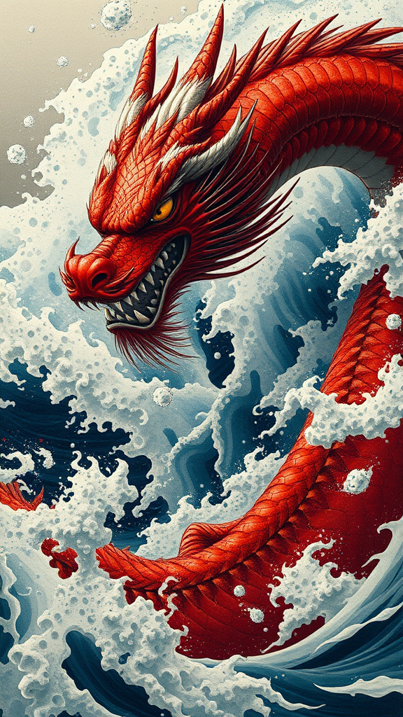 Red dragon surging through turbulent waves, capturing the essence of kōji morimoto’s dynamic touch and neo-traditional Japanese elegance. Influences from John Blanche’s dramatic flair merge with mural-like grandiosity, echoing Tyler Walpole's vivid intensity. The scene presents an up-close, intense focus, weaving an absurdist twist into the composition. The dragon's fierce eyes and intricate scales stand out amidst the swirling waters, embodying a timeless mythological presence.