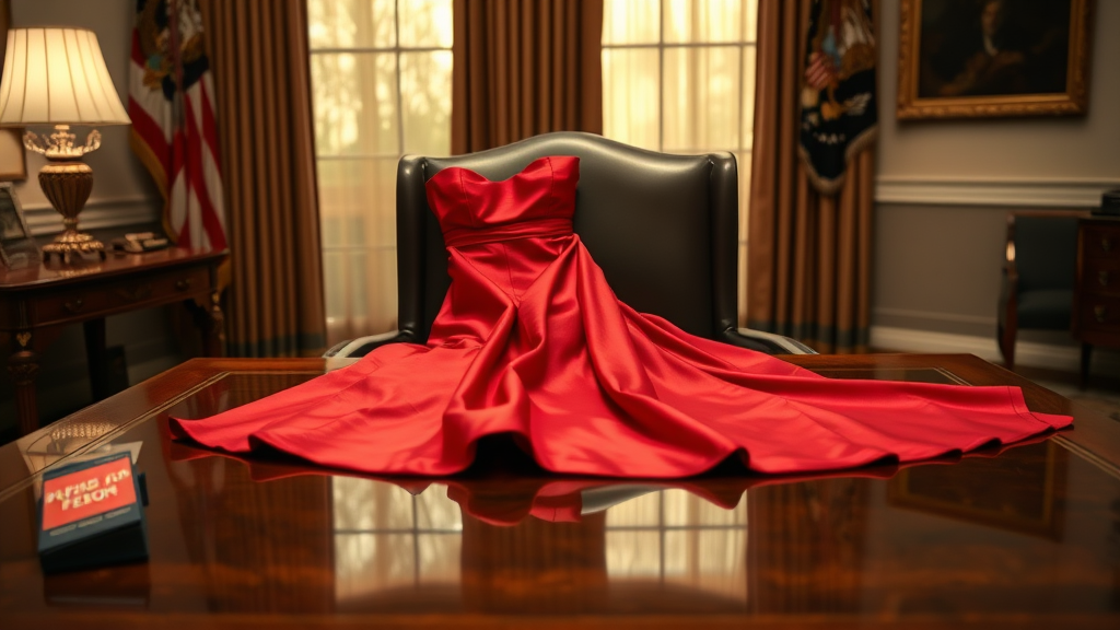 Red dress elegantly draped over polished mahogany desk, classic Oval Office interior, soft ambient light, f2.8, artistic flair, hint of a mysterious presence, subtle touch of intrigue.