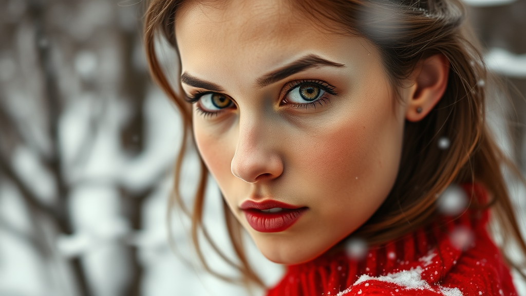 Red dress in a winter background, looking at the viewer, portrait-style photography focusing on detailed skin with a realistic, photo-realistic quality. Captured in 8k resolution, the image is highly detailed, showing a full-length frame. It includes high-detail RAW color art with piercing eyes, using diffused soft lighting. The shallow depth of field enhances the sharp focus, emphasizing hyperrealism with cinematic lighting. Despite some low resolution and imperfections like text errors, cropped features, or artifacts, these elements are minimized. The depiction avoids poorly drawn or distorted anatomy, such as extra or malformed limbs, ensuring natural proportions and gestures.