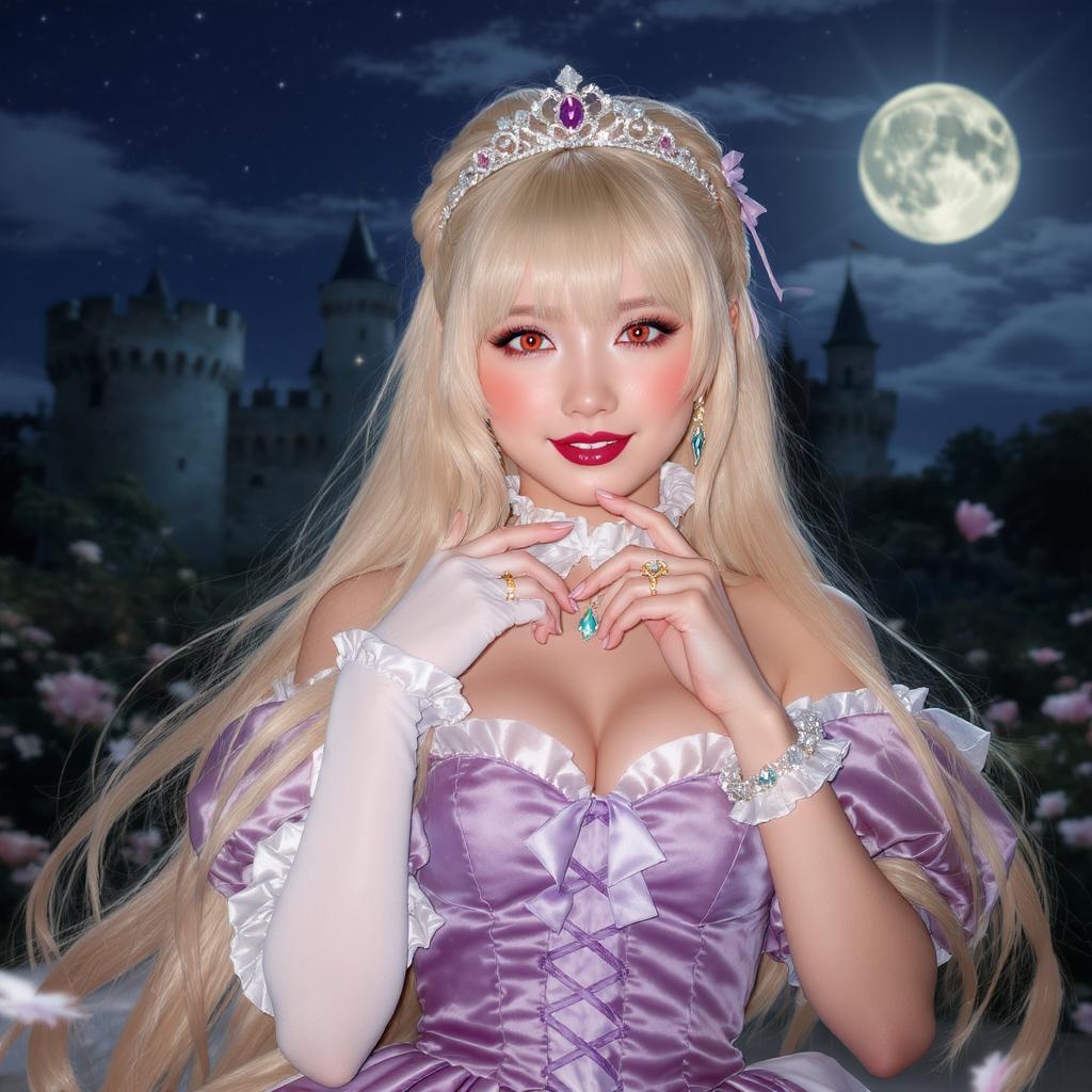 Red eyes, alternate eye color, inspired by Fischl, features a detached collar and sleeves, set in an official alternate costume. Focused on a solo girl with blonde hair cascading over one eye, adorned with a tiara. She wears a dress with a smile gracefully poised and long hair falling over bare shoulders. Her attire includes white thigh-highs, long sleeves with frills, and a touch of elegance marked by a ring on her finger. She has parted lips, a purple dress with puffy Juliet sleeves, lined with pantyhose in a soft white shade. Bangs frame her blushing face as she raises a hand adorned with a ribbon and frilled sleeves, showcasing intricate jewelry. The scene unfolds at night outdoors, near a castle with the moon casting a serene light. The image aims for an 8k UHD HDR quality, capturing the essence of this captivating character without duplications or visual distortions in clarity and detail.