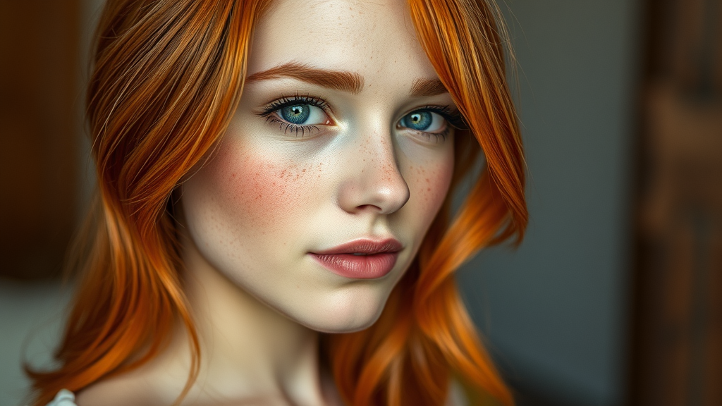Red-haired pretty girl, intricate details, cinematic interior, detailed muted colors, freckles, captivating features, harmonious anatomy, balanced composition, clear focus, graceful elegance, natural expression, serene atmosphere, softly blurred background.