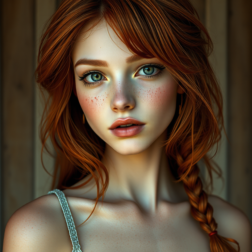 Red-haired, pretty girl, intricate details, cinematic interior, detailed, muted colors, freckles, realistic proportions, seamless anatomy, harmonious composition.