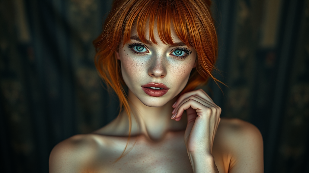 Red-haired pretty girl, intricate details, cinematic interior, detailed, muted colors, freckles, harmonious elements, refined anatomy, natural elegance, vivid clarity, connected limbs, seamless composition, graceful, captivating focus, polished presence.