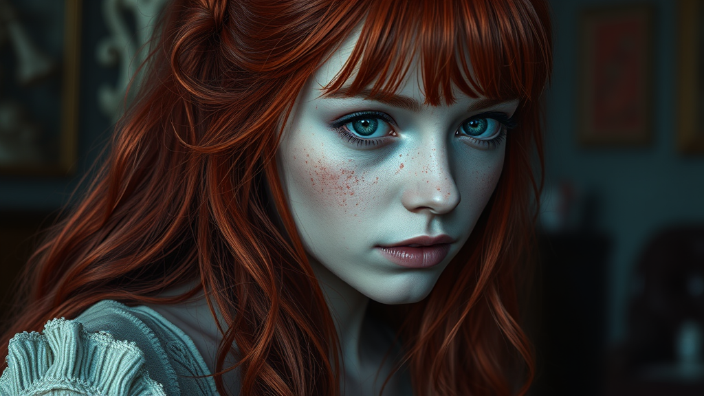 Red-haired pretty girl with intricate details, cinematic style in an interior setting, showcasing muted colors and freckles. The scene should emphasize detail and artistry, avoiding elements such as poorly drawn features, bad anatomy, extra or missing limbs, disconnected limbs, mutations, or any aspects that appear ugly, disgusting, blurry, or involve amputation. The focus is on capturing beauty and meticulous detail in a cinematic environment.