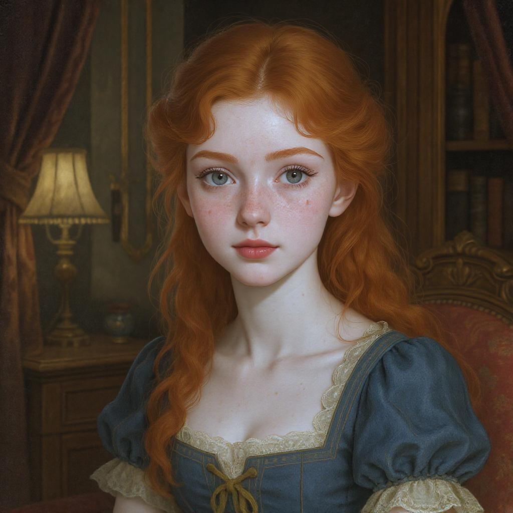 Red-haired, pretty girl with intricate details, cinematic setting, interior scene, detailed, muted colors, and freckles. The focus is on capturing a sense of beauty and complexity, avoiding poorly drawn elements, bad or incorrect anatomy, and ensuring limbs and features are correctly portrayed without mutations or disconnections, maintaining clarity and attractiveness.