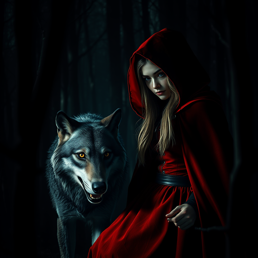 Red Riding Hood in a shadowy forest, her tamed wolf by her side with piercing eyes, both exuding an eerie aura; the scene dark and macabre with a haunting atmosphere. The hyperrealism captures every detail in photorealistic 8k, reminiscent of a cinematic moment created with the power of Unreal Engine, as though a 3D render come to life. The composition, set in an ominous environment, features expressive elements and a saturation level adding to the surreal horror, resembling a vivid scene from a chilling narrative.