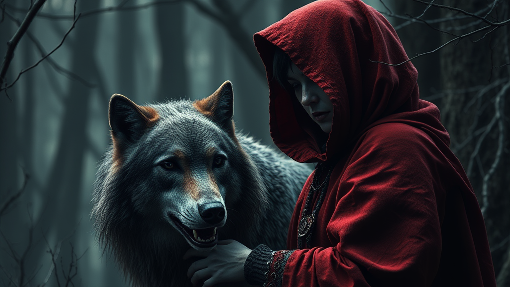 Red riding hood, loyal wolf, eerie and gothic, suspenseful, chilling, ultra-realism, photorealistic, 8k, cinematic quality, immersive 3d render, dark fairytale, moody atmosphere, surreal style, haunting whispers, expressive detail, enchanting wilderness, --ar 9:16, intricate textures, storytelling shadows, vivid emotions, hyper-detailed environment.