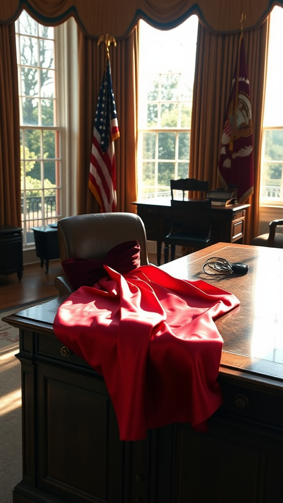Red satin dress elegantly draped over the corner of a polished oak desk in the White House Oval Office, sunlight streaming through the tall windows accentuating the luxurious fabric, hinting at the presence of a woman nearby, atmosphere exuding power and elegance, f2.8 lens capturing the subtle play of light and shadow across the historic room.